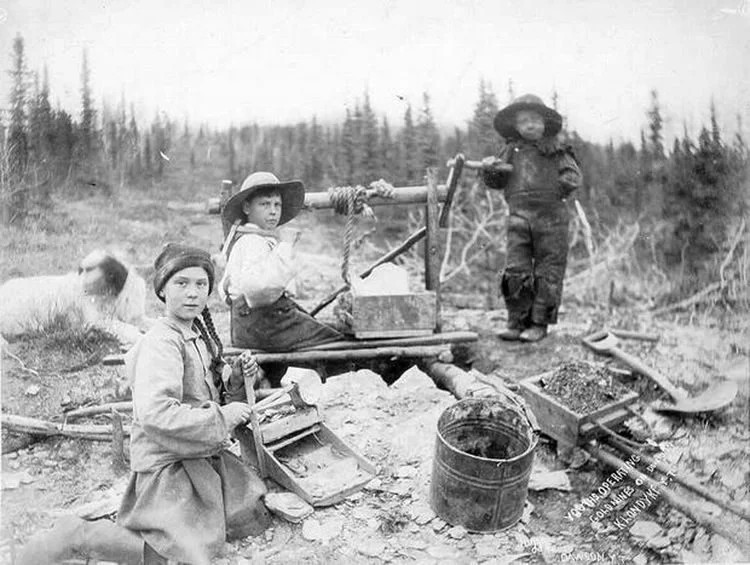 Трое детей просеивают песок на золотом руднике в Доминион-Крик, Юкон, Аляска, 1898 год